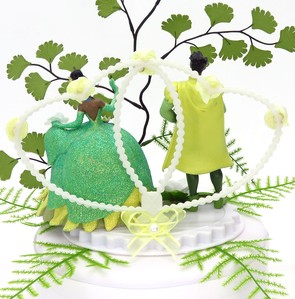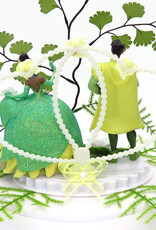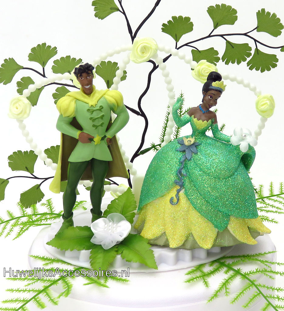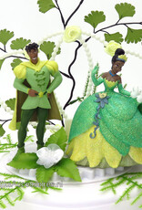 Een zeer mooie Disney taarttopper van Prinses Tiana en Prins Naveen. Achter Tiana en Naveen zijn er 2 witte harten over elkaar heen versierd met gele roosjes. Deze taarttopper van Prinses Tiana en Prins Naveen zal prachtig staan op uw Disney bruidstaart.